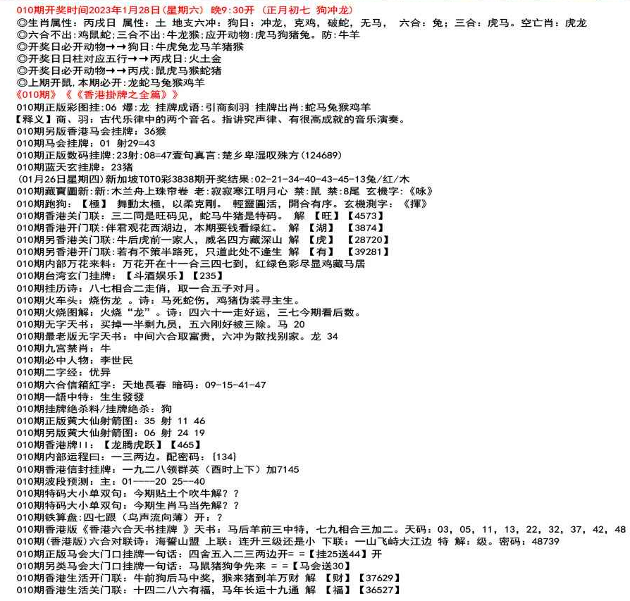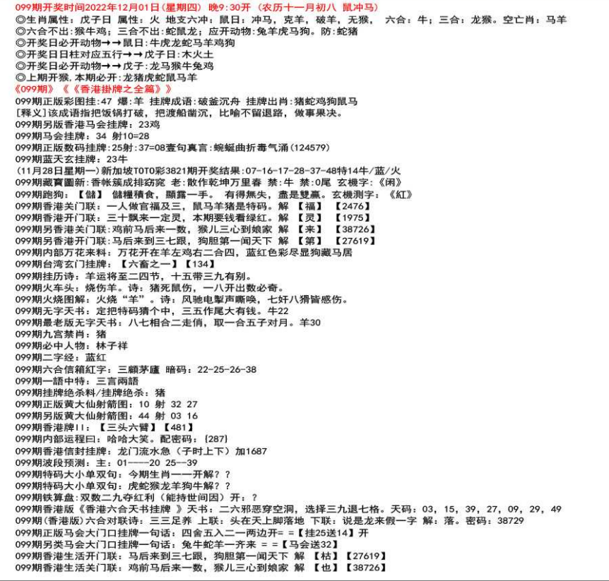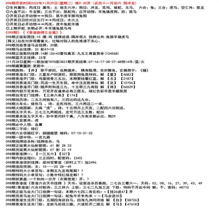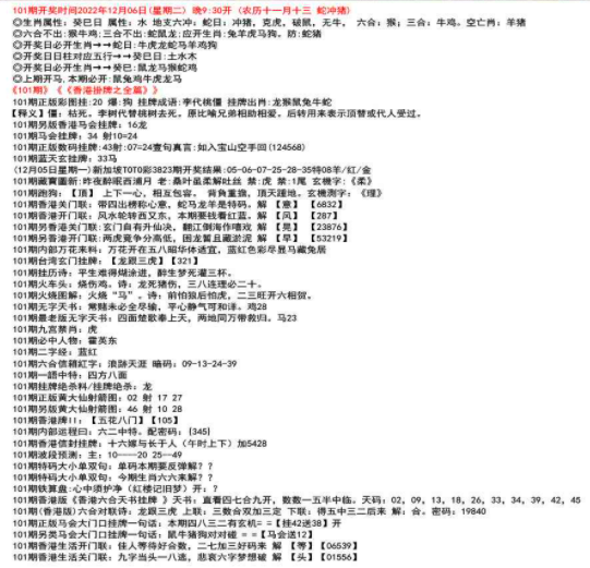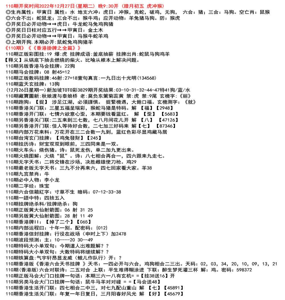 111期开奖时间2022年12月29日(星期四) 晚9:30开 (腊月初七 龙冲狗)◎生肖属性:丙辰日 属性:土 地支六冲:龙日:冲狗,克兔,破猪,无鼠, 六合:鸡;三合:鼠猴。空亡肖:鼠狗